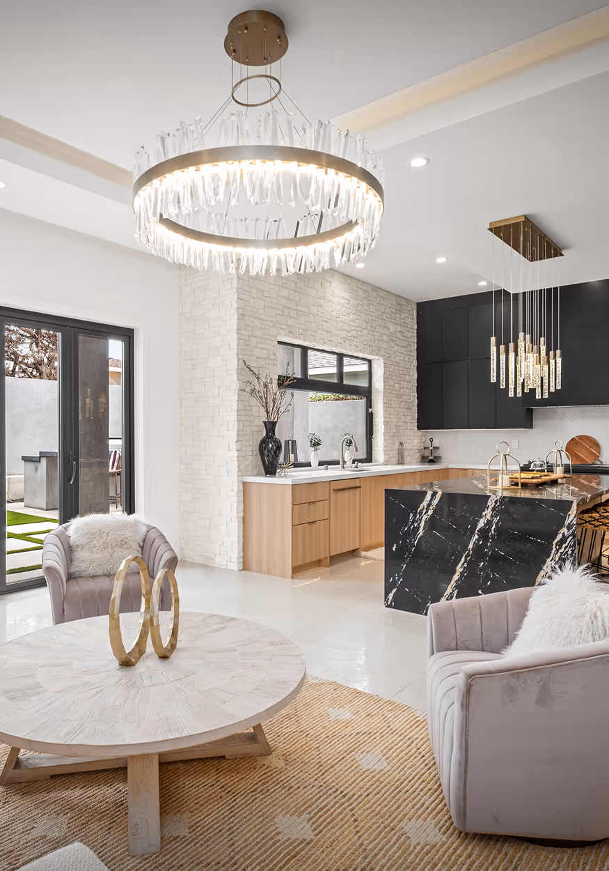 A modern coastal home built around daylight and effortless indoor outdoor living. A marble island kitchen, pale oak floors, and wide glass doors make everyday life feel open, calm, and elevated.