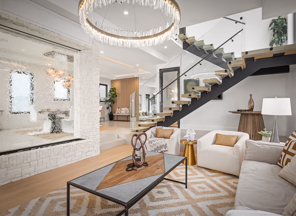 The kitchen is bright and tailored for daily use and easy hosting. A waterfall island in book-matched Calacatta stone anchors the room, paired with warm oak cabinetry and matte taupe uppers. The slab backsplash carries the veining across the walls for a clean, continuous look. A professional range and integrated refrigeration handle service, while a brushed-brass mixer and details add a soft glow. The plan opens to dining and the family room, with large sliders to the courtyard so cooking and entertaining flow outdoors.